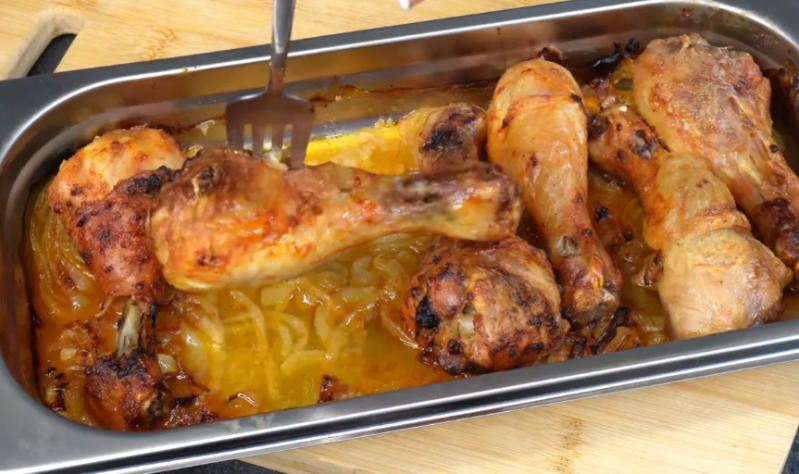 Подготовленные ножки помещаются в гастроемкость, на дно которой укладывают лук, а сверху выкладывают курицу. Поставить в предварительно разогретый пароконвектомат при 160 градусах на 1 час. В это время капустный гарнир можно запечь рядом, чтобы все блюда готовились одновременно.