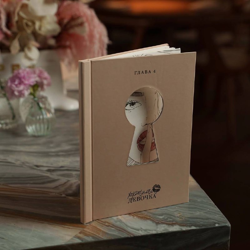 Меню с акцентными деталями, выполненное в мягком розово-персиковом оттенке, принципиально отличается от привычных вариантов. В каждой папке есть прорезь, представляющая собой ключевую деталь, через которую можно увидеть изображение девушки, создавая уютную атмосферу.