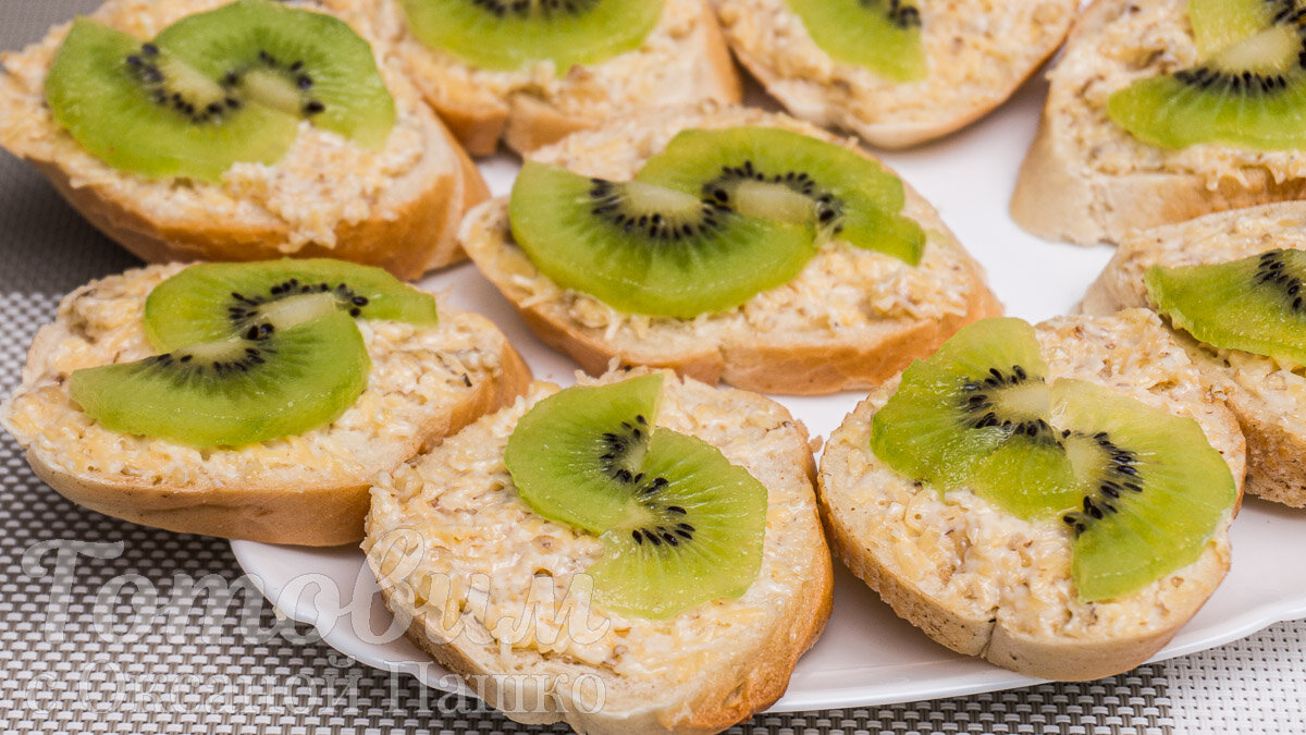 8. Украсить каждый бутерброд парочкой кусочков киви для добавления свежести и цвета.