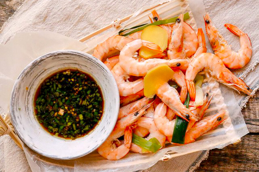 - В кастрюле доведите до кипения 5 чашек воды с нарезанным имбирем, завязанным в узел зеленым луком, солью и шаосинским вином. После закипания добавьте креветки и быстро перемешайте. Готовьте лишь до тех пор, пока они не станут ярко-розовыми, — это займет всего минуту. Не переварите: как только креветки готовы, аккуратно переложите их на тарелку и подавайте с приготовленным соусом. Блюдо готово!