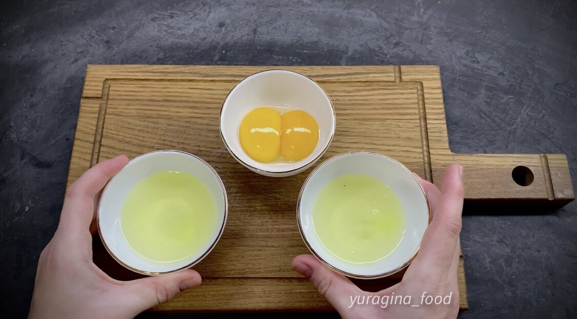 Для начала яйца нужно отделить на белки и желтки, обеспечивая каждый белок в отдельной посуде. Взбиваем один из белков миксером на средней скорости, пока он не начнет пениться. Затем постепенно добавляем 1 ст.ложку сахара и продолжаем взбивать до образования устойчивых белых пиков.