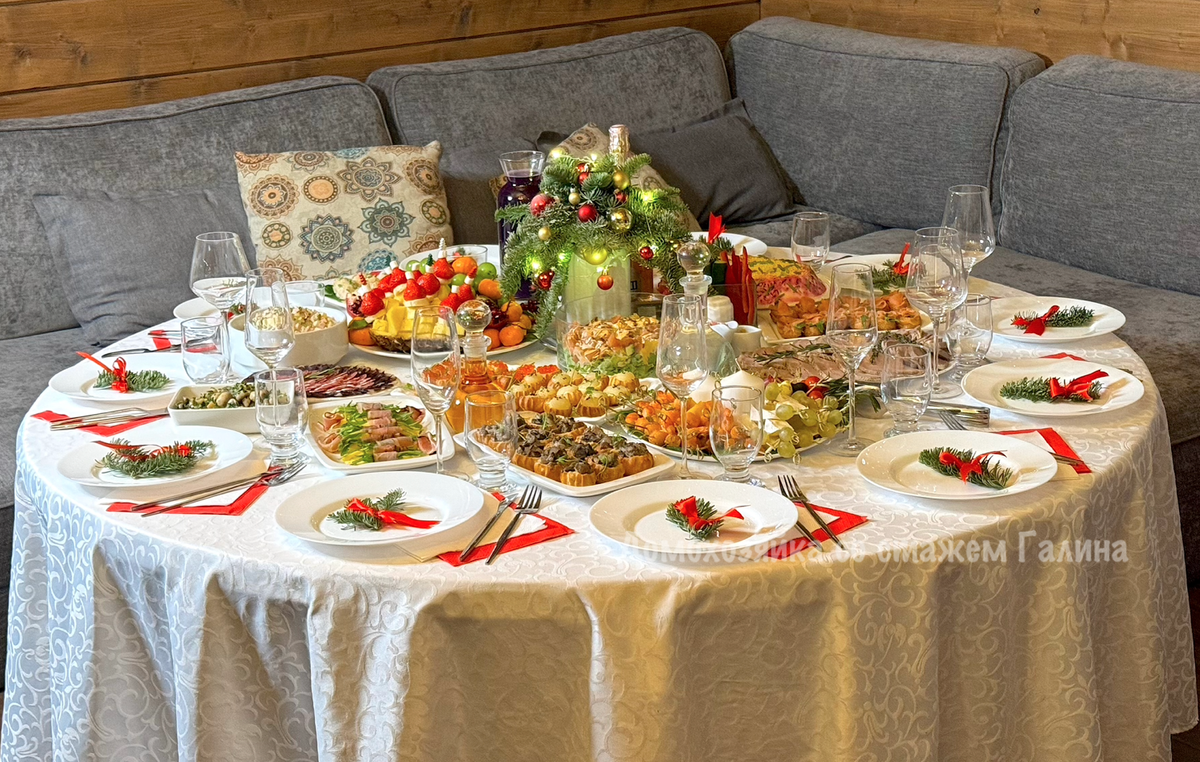 Собравшись за праздничным столом в канун нового года, каждый гость чувствует атмосферу праздника и заботы. Стол был накрыт в 21:00, а к 22:00 вся семья собралась, чтобы проводить старый год и встретить новый. В центре стола красовалась очаровательная новогодняя композиция, созданная любимой невесткой.