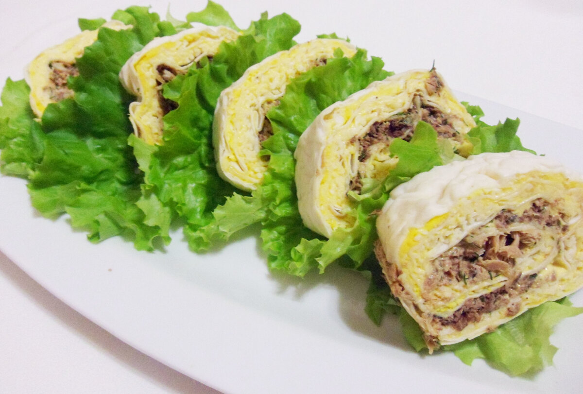 Третий лист лаваша ублажить соусом и равномерно распределить начинку с тунцом. Затем аккуратно свернуть рулет, начиная с длинной стороны.