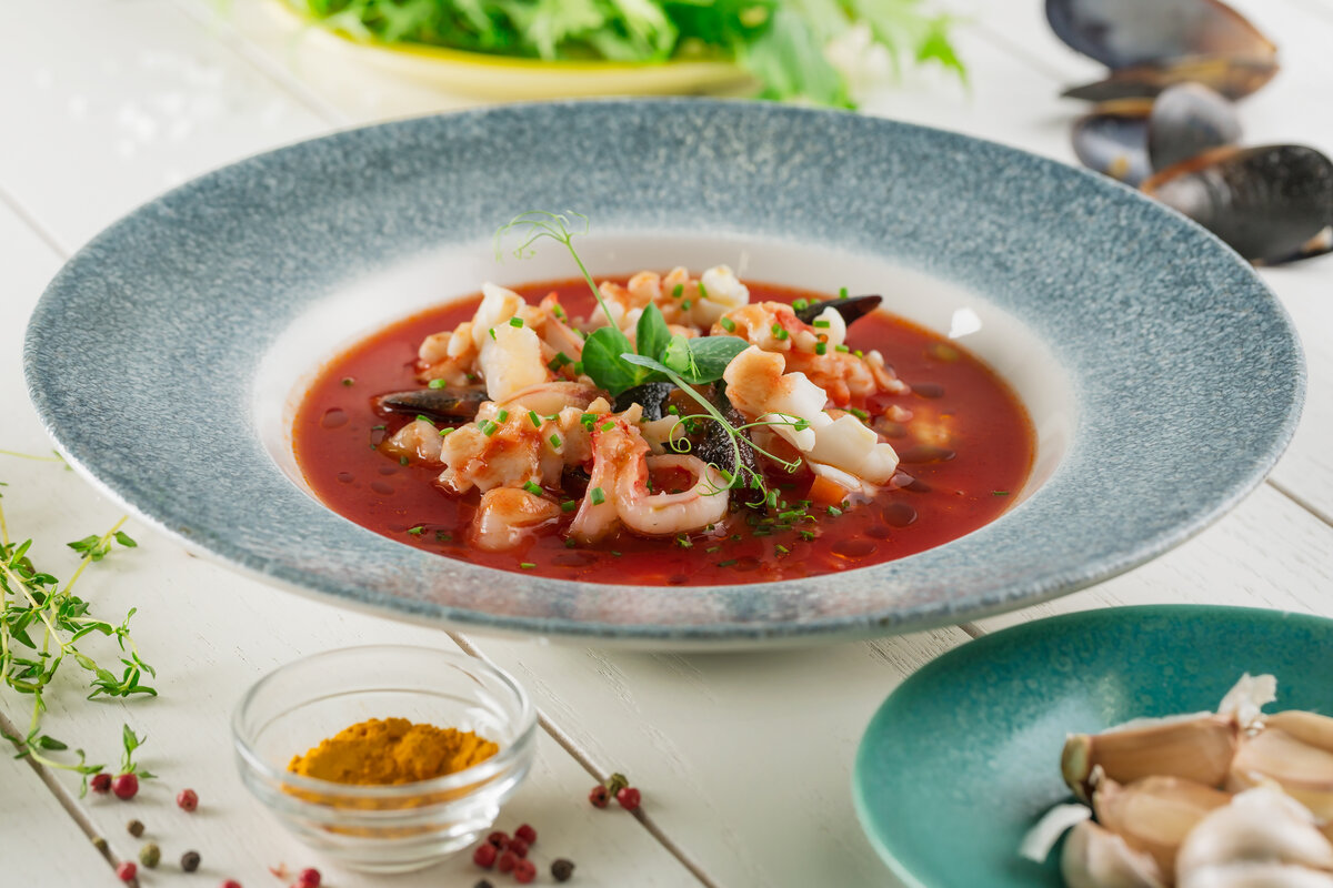 Томатный суп — это не просто второе блюдо, а настоящая кулинарная находка. Его легкость и свежесть делают его идеальным для обеденного стола. А если добавить в эту вкусную базу морепродукты, то получится настоящая кулинарная симфония, наполненная ароматами моря и невероятной насыщенностью.