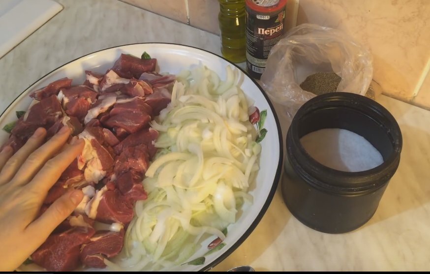 К смеси добавляют соль и тщательно перемешивают, втирая лук в мясо, чтобы он выделил сок. Затем настаивают смесь с добавлением молотого кориандра и черного перца. Поливают уксусом и еще раз перемешивают. Важно оставить мариноваться на ночь, чтобы мясо как следует пропиталось всеми ароматами.