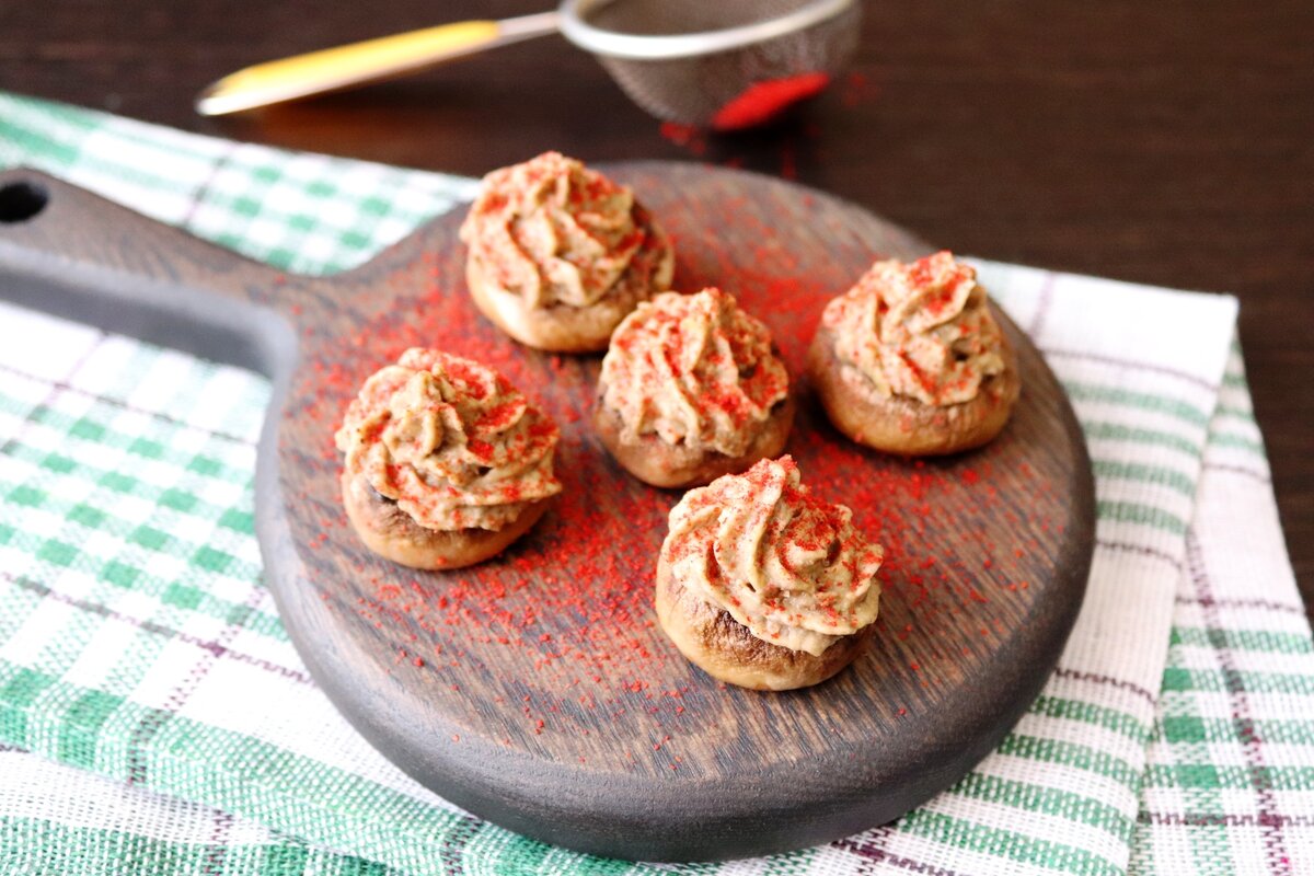 Чечевичное пюре удобно заправить в кулинарный шприц и аккуратно выдавить на запеченные шляпки шампиньонов. При подаче блюдо лучше всего посыпать паприкой для более яркого вкуса.
