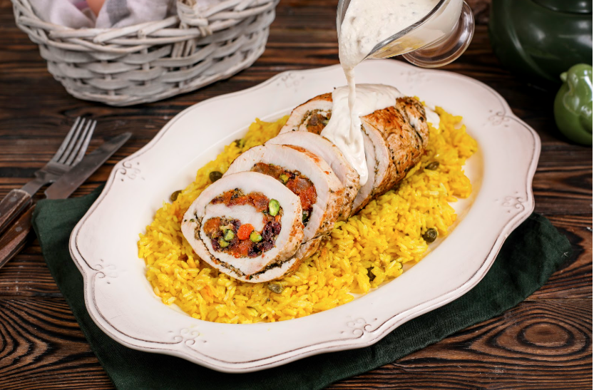 Шаг 7: В готовый рис добавить каперсы, перемешать. Подавайте рулет из индейки с рисом и грибным соусом. Приятного аппетита!