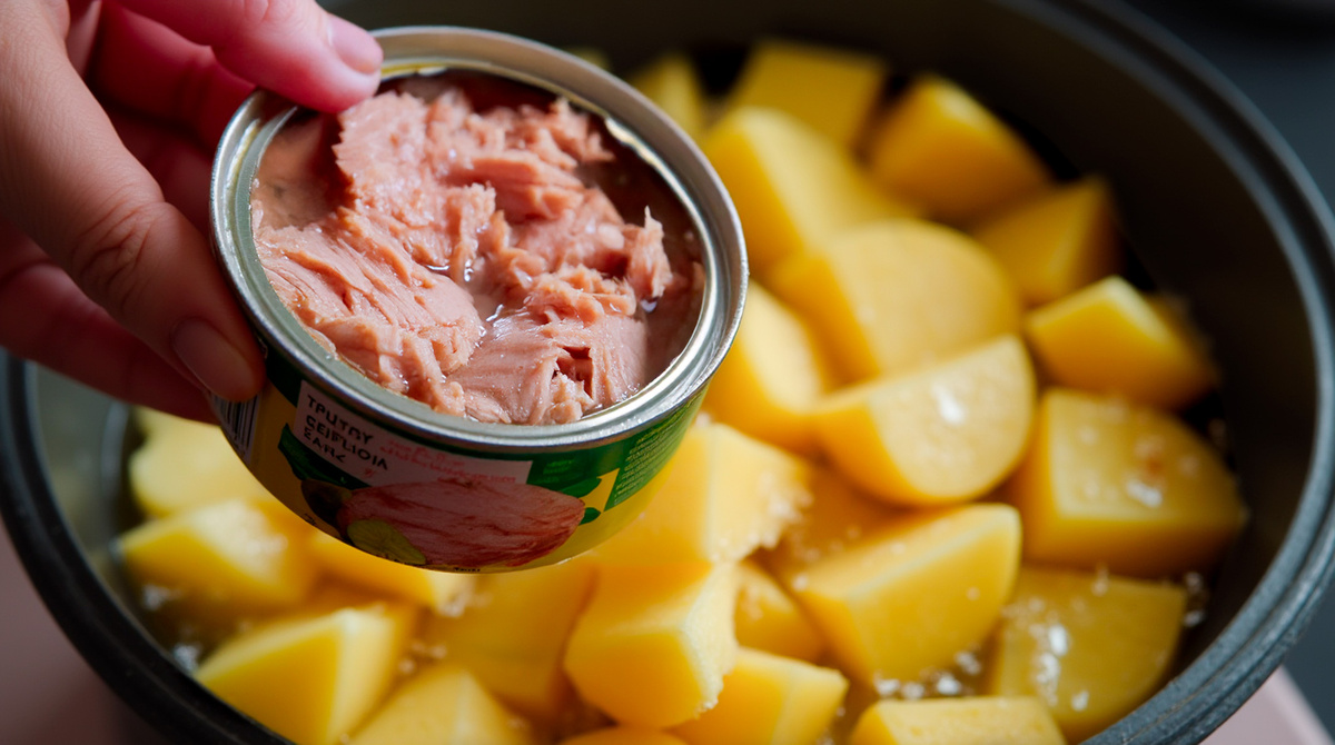 Далее в глубокой миске объединяются картофель, рассыпчатый тунец и яйца. В результате получается ароматная и густая масса.