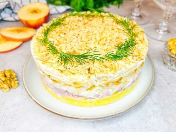 7. Перед подачей мелко нарежьте грецкие орехи и посыпьте ими салат, украшая зеленью. Удалите кулинарное кольцо — и салат готов к подаче на стол!
