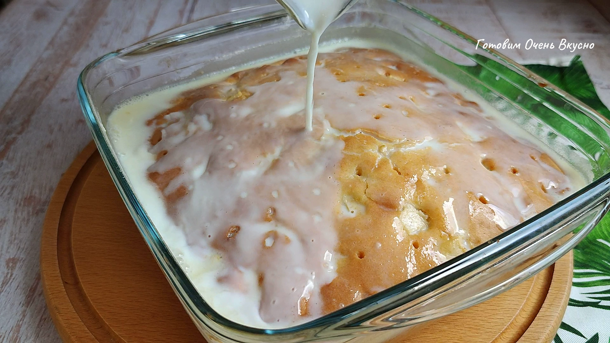Приготовленный пирог извлечь из духовки и проколоть шпажкой. Полить его подготовленной пропиткой и оставить на 10 минут.