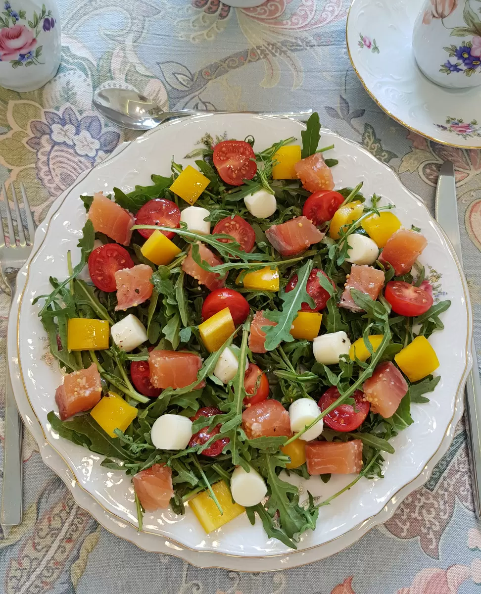 Сейчас, когда на прилавках свежие овощи и вкусная сёмга, пришло время порадовать себя и своих близких невероятным салатом. Это легкое, но насыщенное витамины блюдо удивит всех своим ярким вкусом и эстетичным видом.