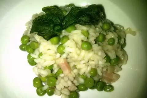 Предварительно промойте горошек. В глубокой сковороде с толстым дном растопите большую часть сливочного масла, добавляя оливковое масло для предотвращения подгорания. Мелко нарежьте лук и панчетту кубиками, обжаривайте их на среднем огне с веточкой розмарина до прозрачности лука. Параллельно нагрейте бульон, чтобы он оставался горячим на протяжении всего приготовления. Уберите розмарин из сковороды, добавьте рис, тщательно перемешайте и продолжайте жарить 2 минуты.Увеличьте огонь и влейте вино, выпаривая в течение 30 секунд постоянно помешивая. Добавьте половник горячего бульона, посолите и варите ризотто 10–12 минут, регулярно помешивая и подливая бульон, чтобы добиться кремовой текстуры. Затем добавьте горошек и готовьте, доливая бульон и перемешивая, еще 10 минут, следя за тем, чтобы рис оставался аль денте.Снимите с огня, добавьте оставшееся сливочное масло и пармезан, тщательно перемешав. Подайте ризотто, украсив свежими листьями мяты и посыпав черным перцем по вкусу.