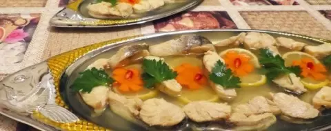 Начинать стоит с подготовки главного ингредиента — рыбы, хорошо подойдет карп. Нужно удалить внутренности, жабры, головы и плавники, а затем залить все это литром воды и варить бульон, следя за тем, чтобы удалить пену и поддерживать слабый огонь. Приготовив бульон, рыба варится до полной готовности. После этого излишки можно выбросить, а саму рыбу следует охладить, отжав отвар для дальнейшего использования.