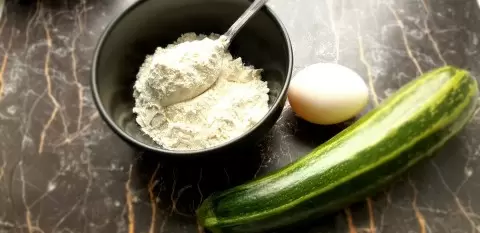 Кабачок натереть на крупной тёрке. В миске соединить натёртый кабачок с солью, яйцом и мукой, тщательно перемешать.