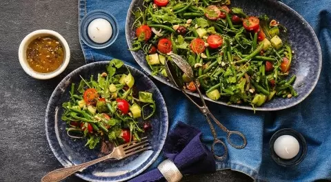Для того чтобы сделать салат более интересным, стоит добавить терпкие оливки каламата и свежую рукколу с лёгким горчичным привкусом. Таким образом, привычная текстура превратится в оригинальное гастрономическое творчество. А вместо животного белка можно использовать орехи, что не только полезно, но и очень вкусно!