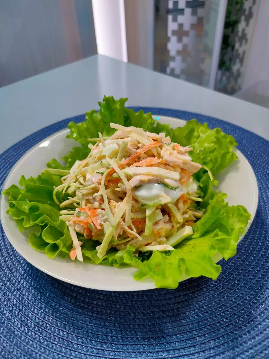Теперь пришло время овощей. Капусту следует нашинковать как можно тоньше, а морковь с огурцом натереть на терке. В отдельной миске смешаются морковь и капуста, которые нужно слегка посолить и тщательно перемешать. Затем добавить курицу, огурец и яйцо, все хорошенько перемешать и, по желанию, досолить.