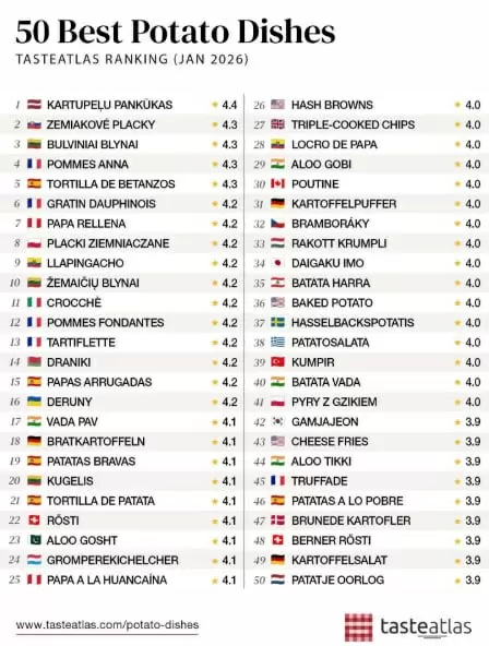 Белорусские драники уверенно вошли в престижный список 50 лучших картофельных блюд всего мира, составленный популярным гастрономическим порталом TasteAtlas. С оценкой 4,2 они заняли почетное 14-е место, подтверждая свою репутацию не только в Беларуси, но и на международной арене.