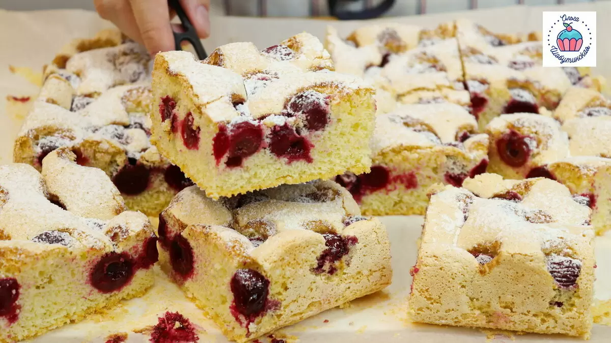 Готовый пирог остудите, аккуратно вынимите из формы и посыпьте сахарной пудрой. Шарлотка получается пышной, с нежным тестом и кисло-сладким вкусом вишни. Это идеальное угощение для чаепития или праздничного стола, которое привлечет внимание и понравится всем гостям!