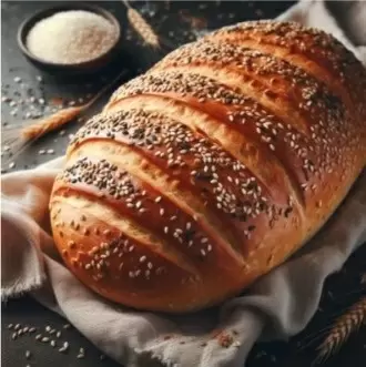 Хлеб помещается на противень, выстланный тефлоновым ковриком. Верх буханки смазывается водой и посыпается целыми семенами льна. Выпекать нужно до готовности, пока хлеб не поднимется и не зарумянится.