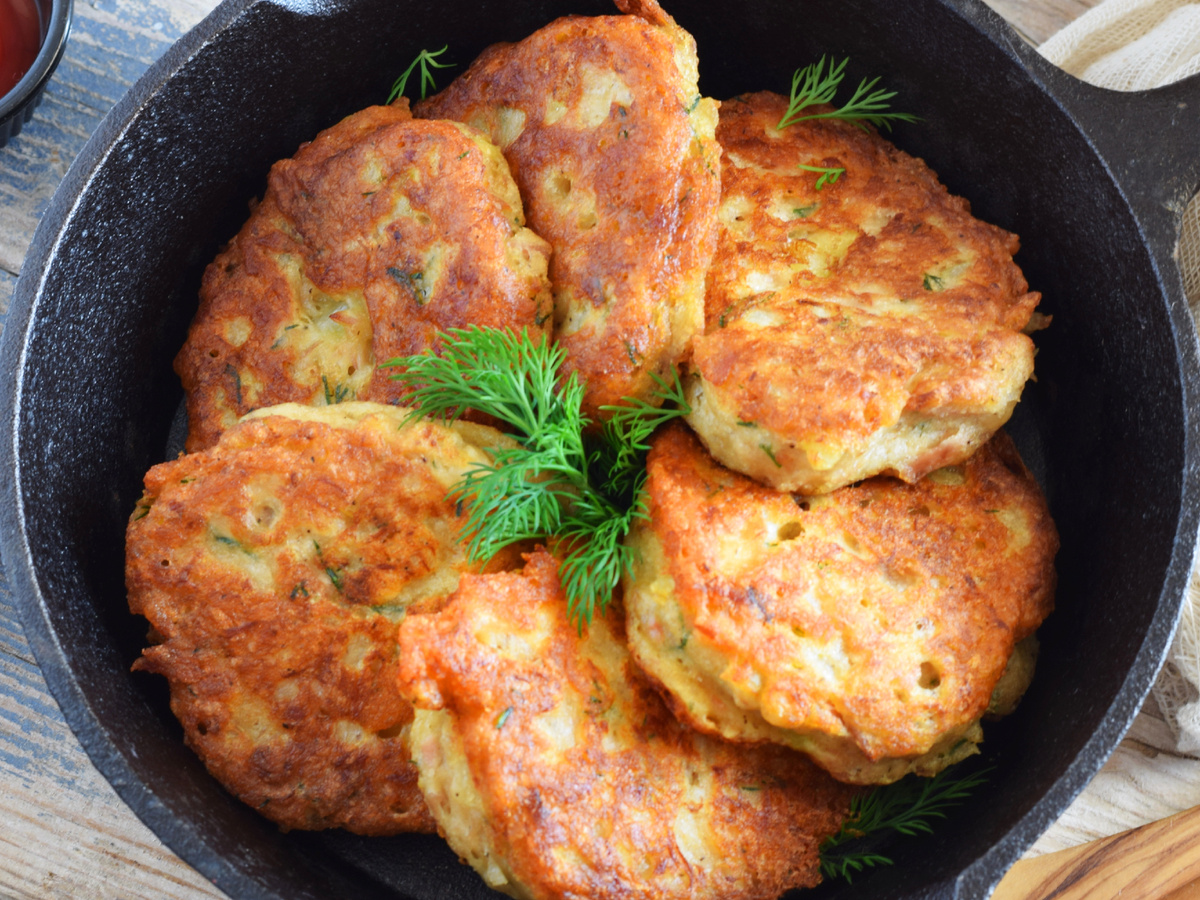В конце добавляют 3-4 столовые ложки муки, чтобы добиться консистенции, напоминающей тесто для обычных оладий. Можно немного отдохнуть — дайте тесту постоять 10 минут, чтобы компоненты объединились и массы стали более пластичными, а оладьи при жарке не расползались.