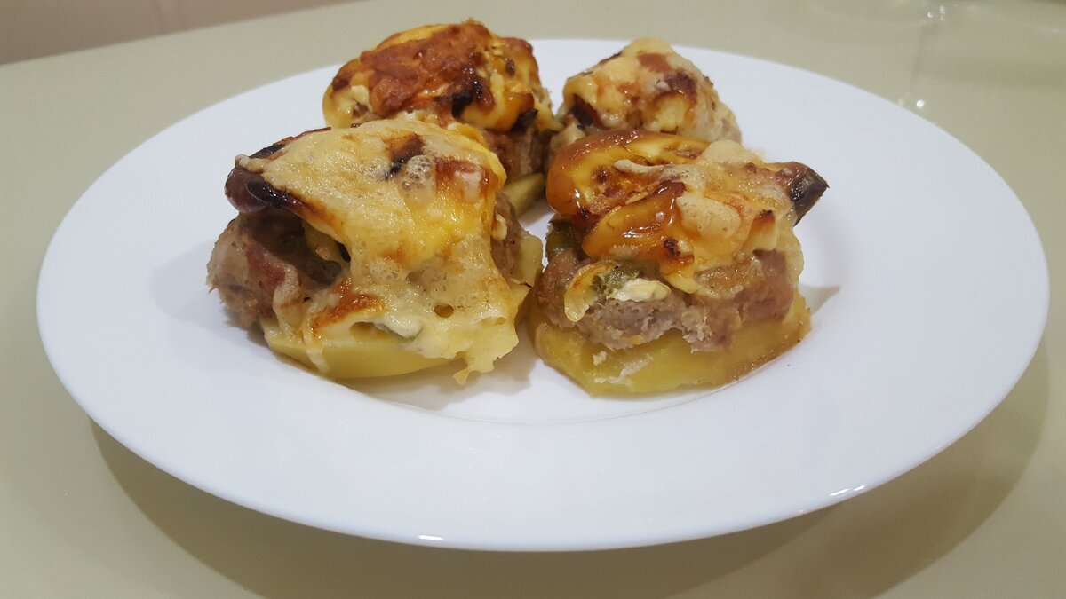 Шаг 1: Начать стоит с картофеля. Очищенные клубни нарезать вдоль, чтобы получить толстые половинки с плоской основой. Каждую половинку заполнить двумя столовыми ложками фарша, равномерно распределив его по поверхности. Затем уложить подготовленные картофельные "клубочки" в форму для запекания.