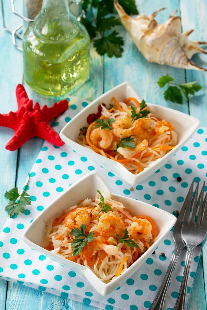 Затем, после извлечения овощей из холодильника, их следует переложить в миску с обжаренными креветками, можно добавить немного свежей зелени.