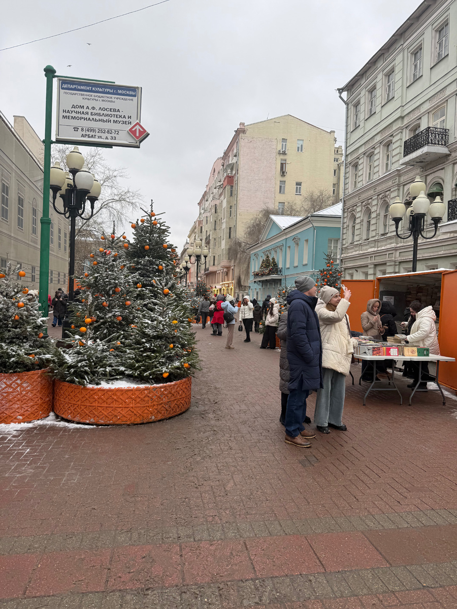 В этом году Арбат поражает своим оформлением: центральным элементом стали великолепные елки, украшенные мандаринами, размещенные в ярких оранжевых кадках. Такое оформление создает уникальную атмосферу праздника, и хотя людей много, по сравнению с известными местами, такими как Площадь Революции или Большой Театр, здесь можно насладиться спокойным времяпрепровождением.
