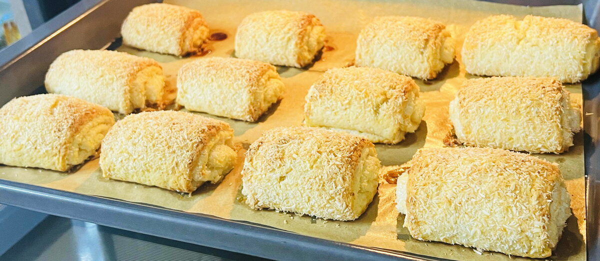 Далее тесто делится на две равные части, каждая из которых раскатывается в тонкий пласт. В качестве начинки используйте кокосовую стружку, предварительно смешанную с сахаром. Одним краем теста заверните начинку в рулет, сформировав трубочку.