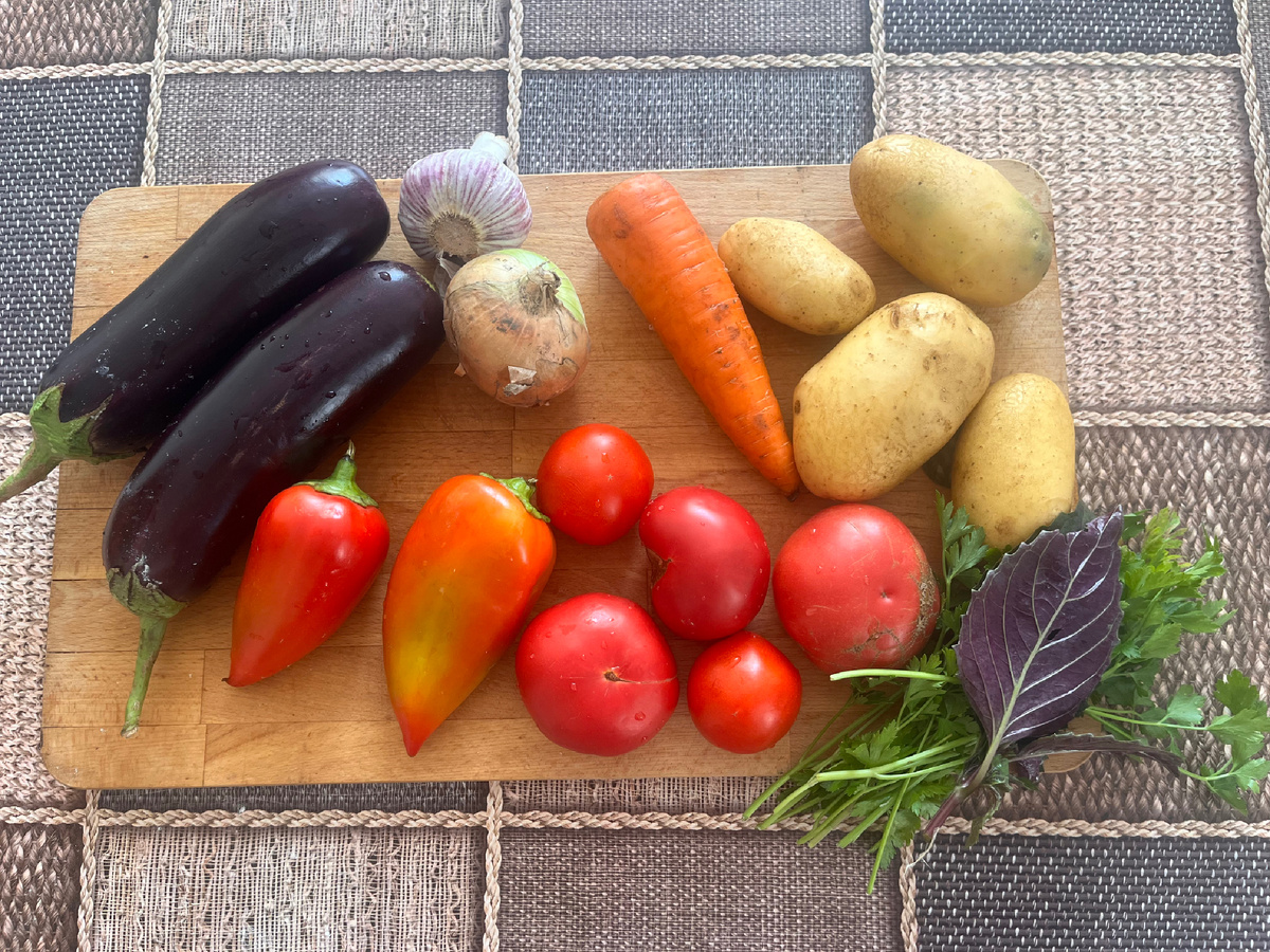 Для начала необходимо подготовить все овощи. Лук нарезать полукольцами или кубиками, картофель и морковь — кубиками, баклажаны — небольшими кусочками, которые можно посолить и оставить на 15 минут, чтобы избавиться от горечи. Болгарский перец нарезать соломкой, а помидоры — крупно.