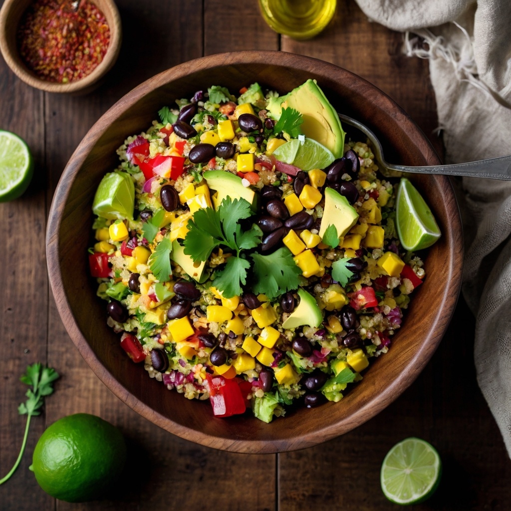 - Салат из киноа с черной фасолью и авокадо — свежий и яркий салат станет отличным дополнением любого стола. Используйте такую комбинацию: киноа (150 г), черная фасоль (200 г, отварная или консервированная), один авокадо, кукурузу (150 г), красный лук и сок лайма для заправки.