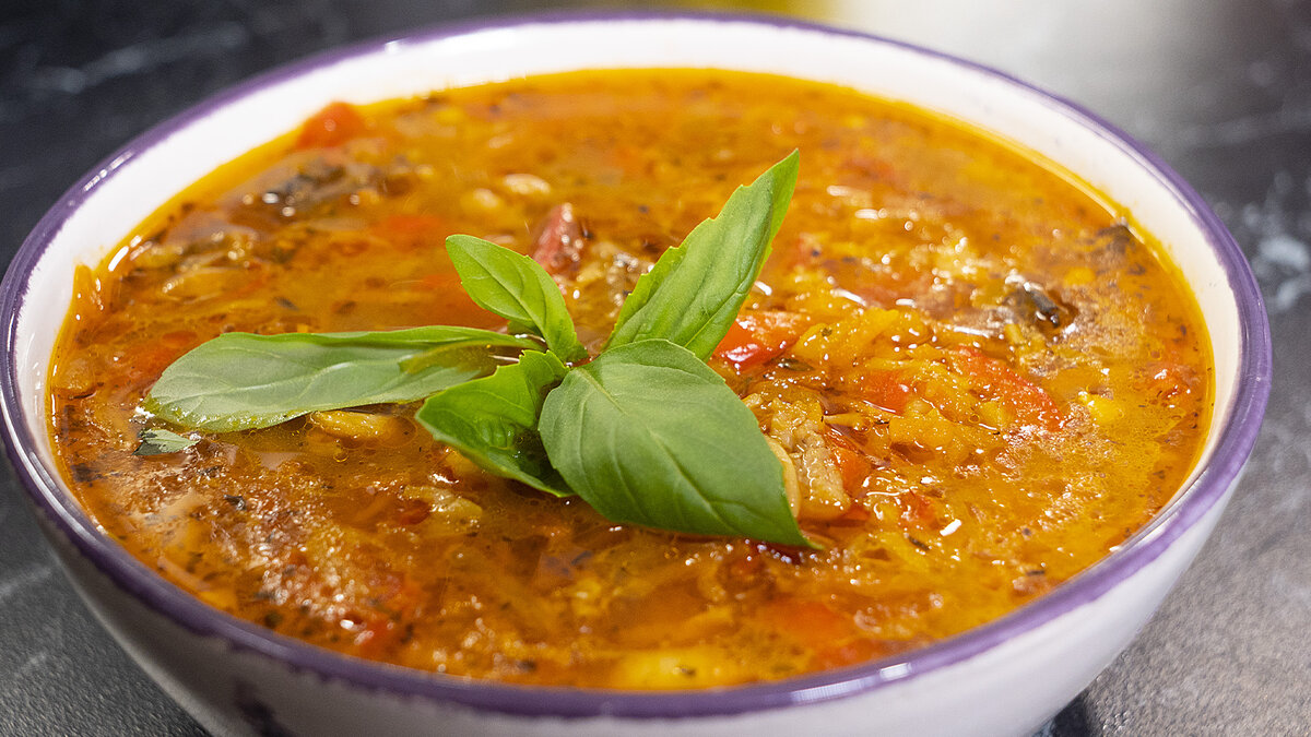 Когда основа супа будет готова, добавьте черри, нарезанную тыкву и морковь. Приправьте по вкусу солью, перцем, орегано, тимьяном, шафраном и ещё одним зубчиком нарезанного чеснока. Не забудьте выжать немного лимонного сока и варите еще 10-15 минут. При подаче украсьте свежими листиками базилика.