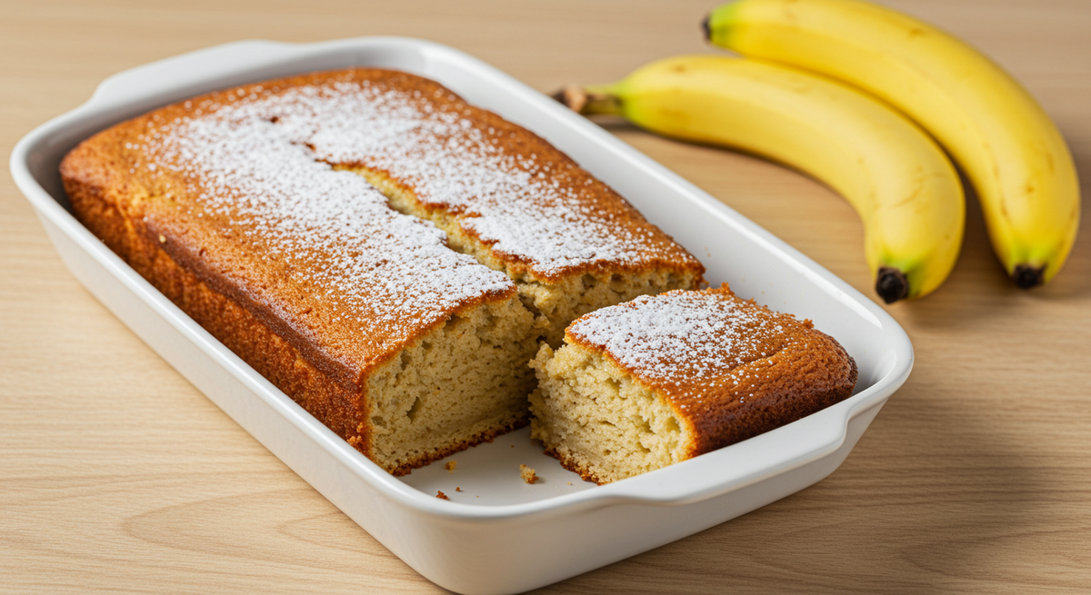 Как только пирог готов, дайте ему немного остыть, посыпьте сахарной пудрой или переверните на блюдо так, чтобы бананы оказались сверху. Этот банановый шедевр получился очень нежным, с легкой сладкой корочкой. Простой в приготовлении, этот десерт идеально подходит даже для самых загруженных дней, ведь в нем нет необходимости использовать миксер.