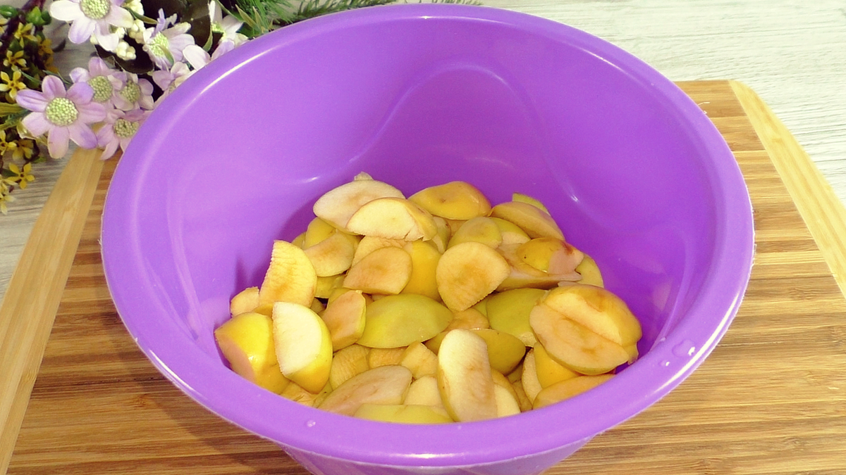 Яблоки лучше использовать домашние и не очищать от кожуры. Для удобства, их нужно нарезать дольками и измельчить в блендере, но не до состояния пюре. Если яблоки крупные, то идеально подойдёт и крупная тёрка.