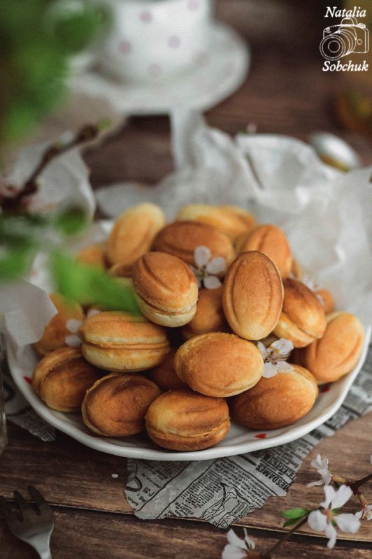 2. Выпекание: Сформировать небольшие шарики из теста и готовить их в разогретом мультипекаре или орешнице по 3 минуты. Охлажденные половинки аккуратно обрезать и наполнить начинкой из взбитого масла со сгущенкой. Далее соединить половинки вместе.