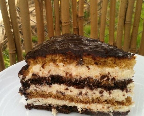 Каждый корж разрежьте пополам. На блюдо выкладывайте сначала тёмный корж, промазывая его кремом. Чередуйте коржи, пока не закончатся все части. Для глазури смешайте все ингредиенты и доведите до загустения на медленном огне. Залейте торт глазурью и дайте ему настояться в холодильнике 1-2 часа. Приятного аппетита!