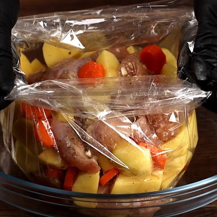 Теперь можно перейти к запеканию. Переложите массу в рукав для запекания, заверните его по краям и сделайте несколько проколов зубочисткой для выхода пара. Установите в предварительно разогретую до 190°C духовку на 1 час. В результате получится аппетитное и ароматное блюдо, которое понравится всем вашим близким.