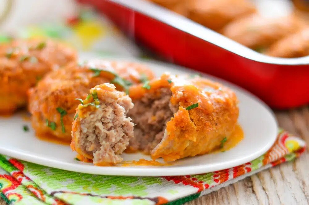 В глубокой миске смешивают сметану, томатную пасту, муку, добавляют соль и перец, заливают водой и хорошо перемешивают до однородной консистенции. Эта смесь заливается на котлеты в форме, и блюдо отправляется в разогретую духовку примерно на 35 минут. В итоге котлеты должны стать румяными, а заливка — густой.