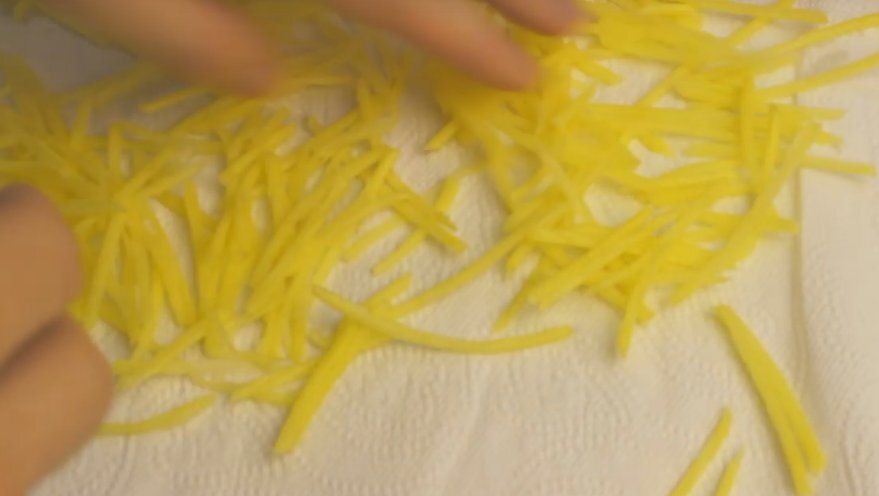Первый этап – подготовка картофеля. Его следует очистить и натереть на специальной терке для корейской моркови. Затем промыть под холодной водой, чтобы избавиться от лишнего крахмала, и выложить на бумажные полотенца для обсушки.