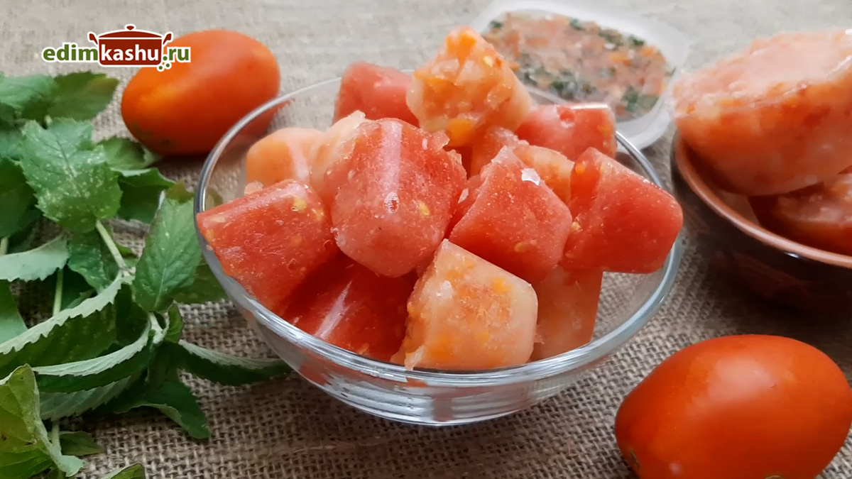 Томатное пюре, полученное при помощи мясорубки или блендера, тоже прекрасно замораживается. Его можно разлить в формочки для льда и хранить в морозильнике, что позволяет использовать нужное количество в любой момент.