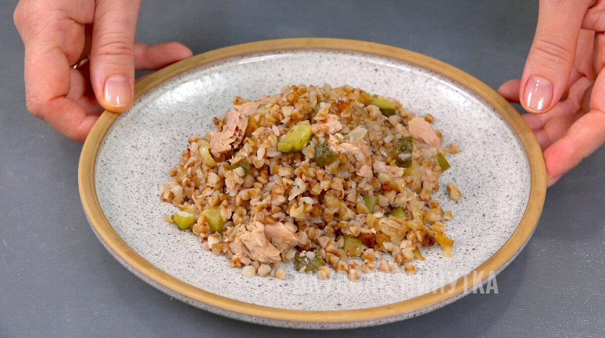 Когда лук готов, к нему добавляют отваренную гречку, нарезанные огурцы и банку консервированного тунца в масле. Важно отметить, что вкус готового блюда во многом будет зависеть от качества тунца, так что не стоит экономить на этом ингредиенте.