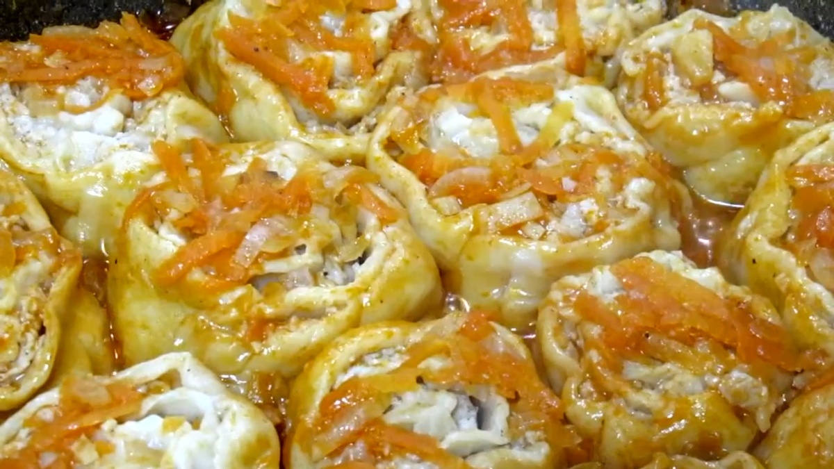 Нарежьте рулет на кусочки и аккуратно сформируйте их в виде «розочек». Выложите подготовленные пельмени в соус и готовьте под крышкой на среднем огне около 25 минут, периодически поливая их соусом. Если соуса недостаточно, добавьте немного воды.