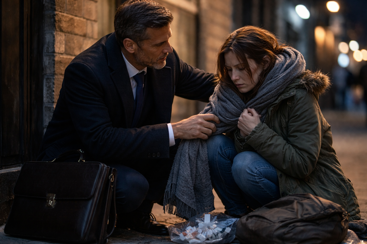 Сергей смотрел на неё и чувствовал, как мир вокруг разделился: в его жизни проблемы решались подписями и переводами, в её — женщина лишь существовала на холодной улице, не зная, как спастись.