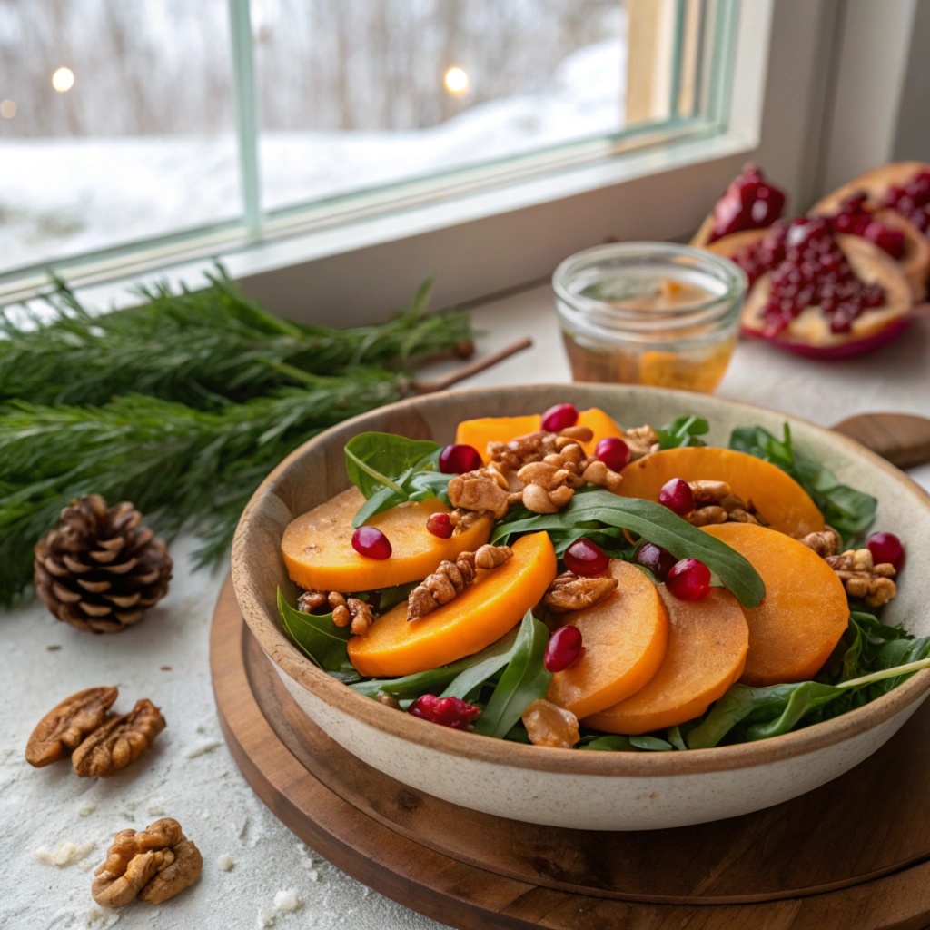 Хурмовый салат с гранатом и ореховым дрессингом