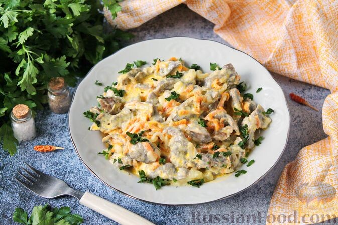 - Куриные желудки в сметанном соусе – нежное блюдо, которое просто готовится. После предварительного отваривания желудков, их тушат в сметане с добавлением горчицы, чтобы подчеркнуть вкус.