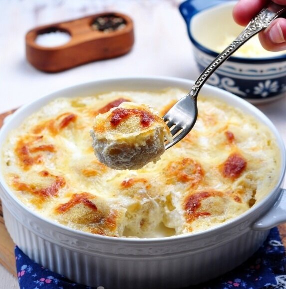 Выложить запеченные фрикадельки в форму, залить соусом и запекать при 180°C в течение 15-20 минут. Манка впитает сливки, делая фрикадельки более сочными.