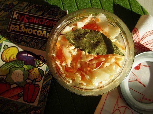 Тщательно нашинковать капусту и натереть морковь на крупной терке или воспользоваться кухонным комбайном.Переложить овощи в чистую трехлитровую банку.В 2.5 литрах холодной воды растворить соль.Залить капусту рассолом и добавить лавровые листы.Накрыть горлышко банки марлей и оставить при комнатной температуре на три дня.После этого слить рассол и снова залить капусту 2.5 литрами воды, добавив сахар.Убрать банку в холодильник еще на сутки для настаивания.