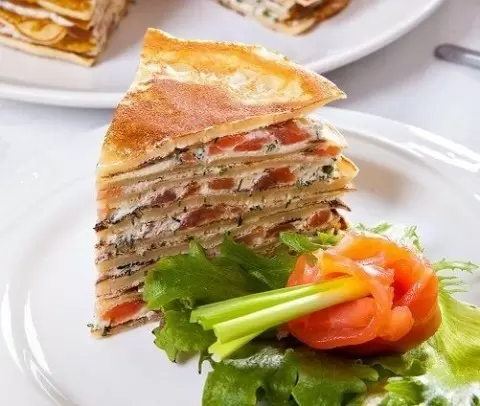 Этот блинный торт порадует не только вкусом, но и яркостью оформления. Сочетание нежного творога с сочной семгой создаст настоящий кулинарный шедевр на вашем столе. Посмотреть рецепт.