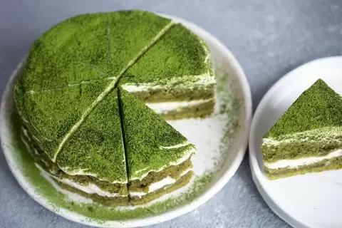 В глубокой миске комбинируют муку, сахар, матча, соль, соду и разрыхлитель. Затем добавляют яйца и растительное масло, тщательно перемешивая до получения однородной массы. Далее вливают кефир и снова перемешивают. Оставляют тесто на 10 минут для достижения нужной консистенции.В форму диаметром 18 см наливают половину теста и выпекают при температуре 170 градусов в течение 20-25 минут. Проверяют готовность с помощью зубочистки: если она выходит сухой, корж готов. Остужают корж в течение 30 минут. Повторяют процесс с оставшейся частью теста.Холодное сливочное масло нарезают кубиками и перемешивают с сахарной пудрой с помощью миксера, пока масса не станет слегка белесой. Затем добавляют творожный сыр и взбивают до однородности.Чтобы достичь большей многослойности, коржи можно разрезать на две части и промазывать их кремом. Для сочности рекомендуют оставить торт в холодильнике на ночь.