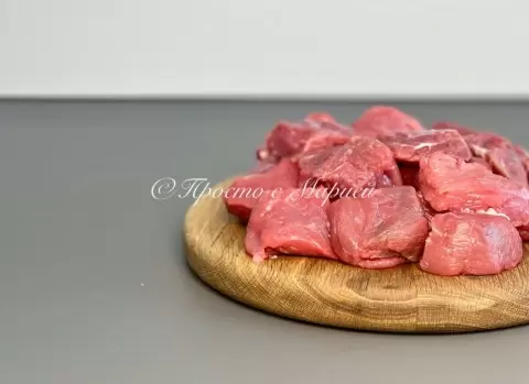 - Говядины нарезают небольшими кусочками и обжаривают на растительном масле на сильном огне всего 3-4 минуты, чтобы сохранить сочность мяса.