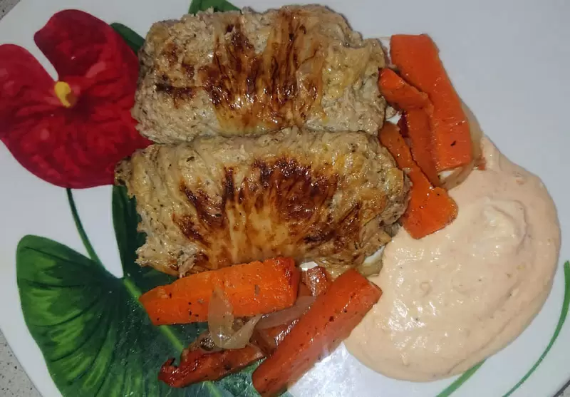 Формирование голубцов: листья пекинской капусты не требуют предварительного ошпаривания. На каждый лист выложить порцию фарша и аккуратно завернуть в плотный ролл. Обычно получается 5-6 голубцов.